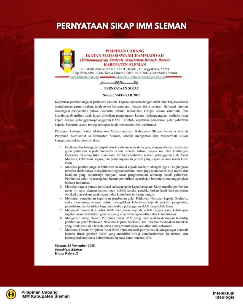 Pernyataan Sikap PC IMM Sleman Mengenai Gelar Pahlawan Nasional Soeharto